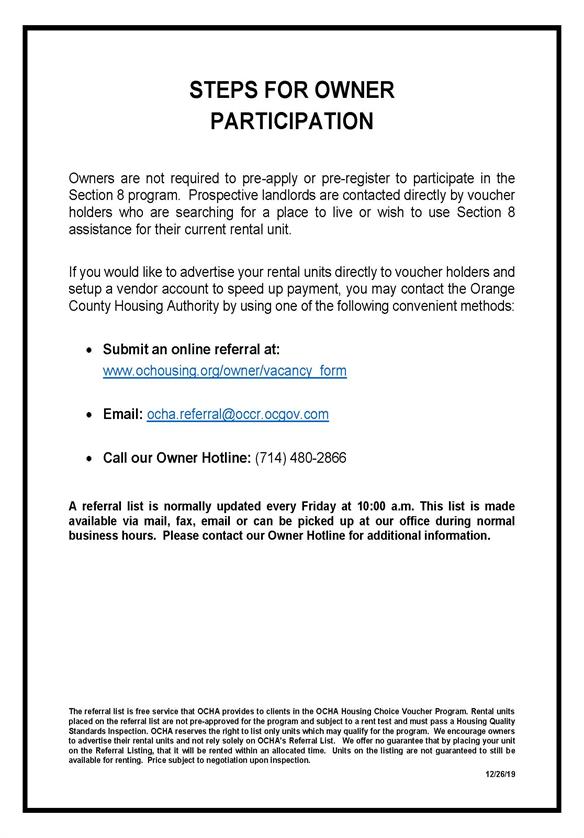 The Orange County Housing Authority (OCHA) recently received limited funding through the County of Orange for a landlord incentive program. The incentives provided under this limited program include a landlord unit signing bonus structure for new and existing landlords, security deposit assistance for OCHA participants*, and refrigerator costs reimbursement for OCHA participants.